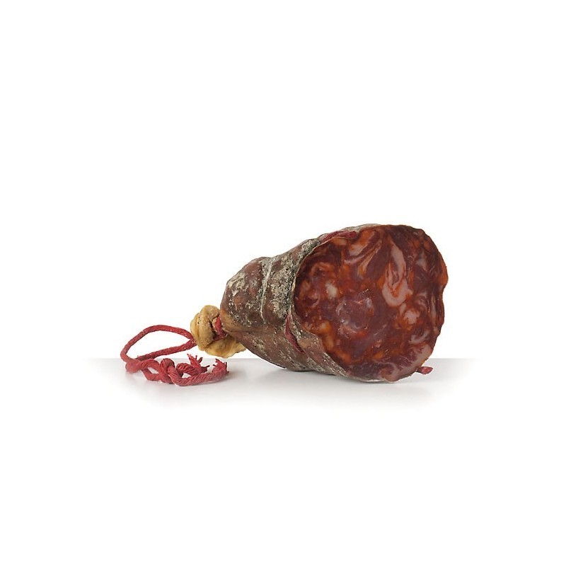 Además la fórmula tradicional de nuestro adobo (en este caso también empleamos una receta propia con casi cien años de antigüedad): sal, especias naturales y aditivos, hace que, tras embutir la mezcla resultante en tripa, su proceso de maduración-secado en bodega le confiera una gran estabilidad, así como unas características organolépticas singulares que junto a su gran formato. Resultando un guiño a la tradición y a los sabores más clásicos de nuestra tierra.