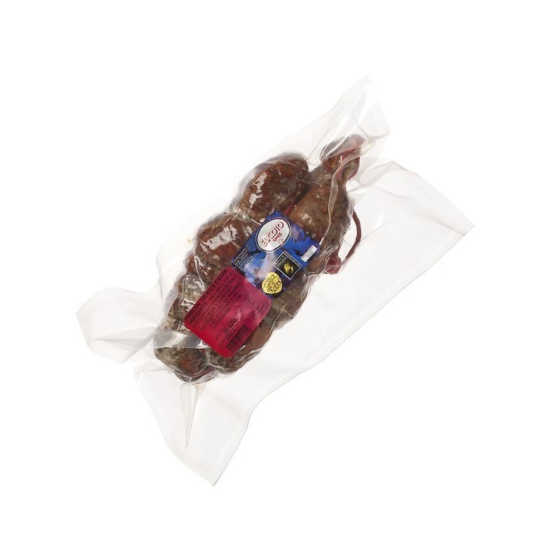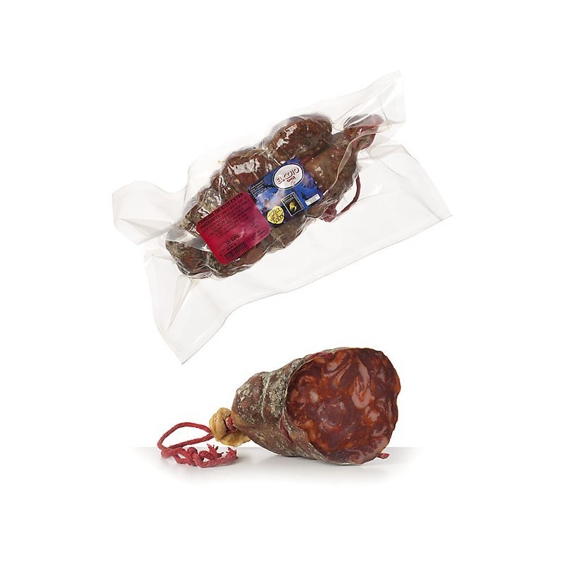 Carne y grasa de cerdo ibérico, sal, pimentón, ajo, dextrosa, lactosa, dextrina, proteína de soja, proteína de leche, especias, emulgentes (E-450i y E-450iii), antioxidantes (E-300, E-301 y E-330), potenciador de sabor (E-621) y conservantes (E-252 y E-250).